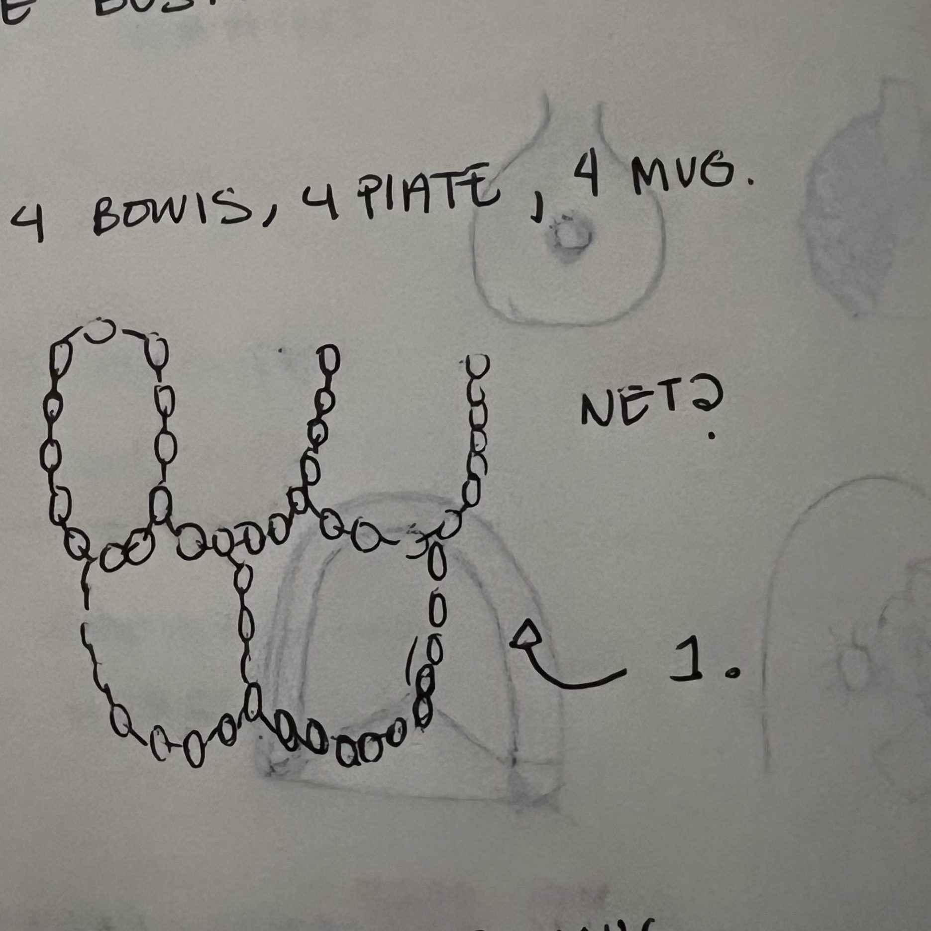 The sketch below will be part of the first project I want to take on this semester. I am still very interested in finishing firing the old vest while starting project one, a net, inspired by a metal basketball net. I plan for this to be large… and hopefully hang from the ceiling? I think…
