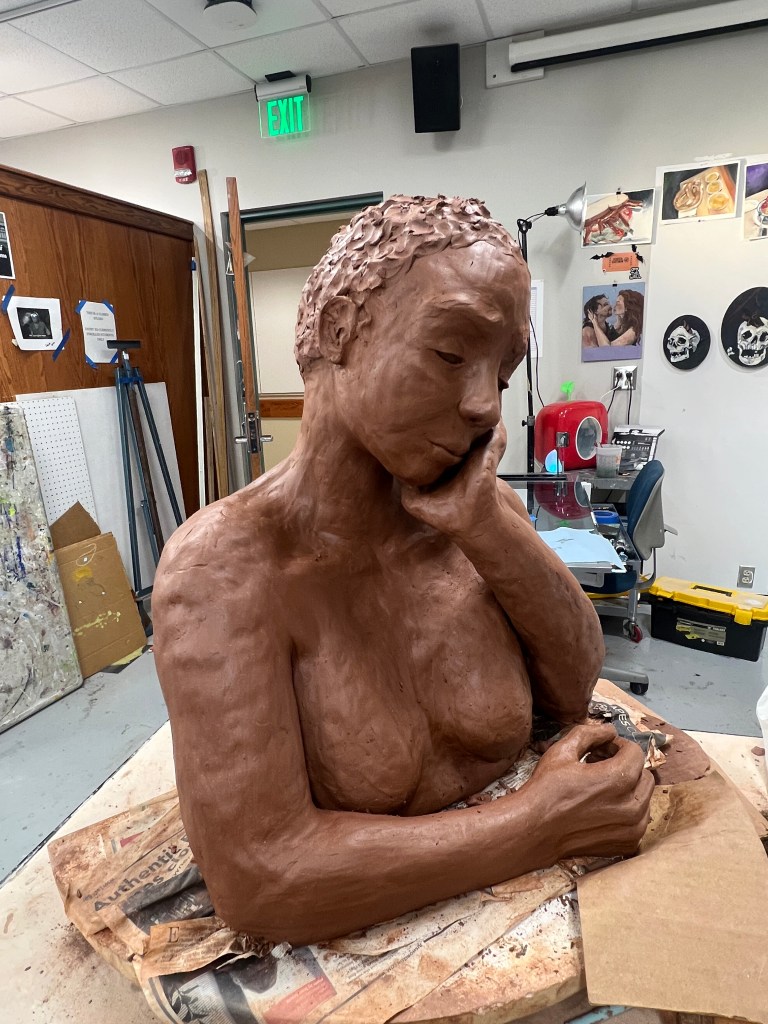 Despite the obvious struggles, I am happy that is almost done and I am also very proud of building a larger bust and it looks cohesive-ish lol (it’s still trrash tho) overall. In today’s class I am planning on adding volume to the back, call it because at this stage there is very little I can do since the clay is drying. and i feel like i already took too long on this piece.