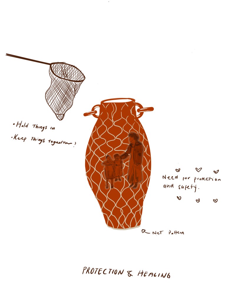 I still haven’t decided what is going around the vase but I like the idea of this net-like pattern and what it may mean. I landed on that pattern while wanting to incorporate textures or shapes that I see on the original image, what caught my attention was the waves or ripples that are around the top edges of the image. It comes from me taking a picture of the photo while it is behind plastic in a photo album.