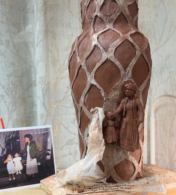 I guess what I don’t like is how the adult figure looks childlike or like a caricature, in the photo my mom is tall and slim. Her dress has elongated folds and vertical textural lines. In the sculpture everything is more rounded and blobby and I know it is mainly because I just started building the sculpture part and they are not super well defined yet. Still, it’s throwing me off to look at it while I sculpt my sister and me. lol while this is an issue now, I am confident in my abilities and I am excited and grateful to be able to explore through clay.