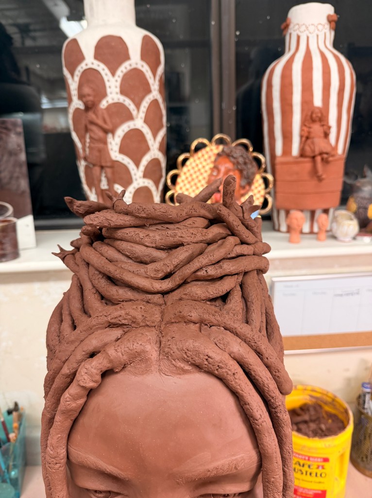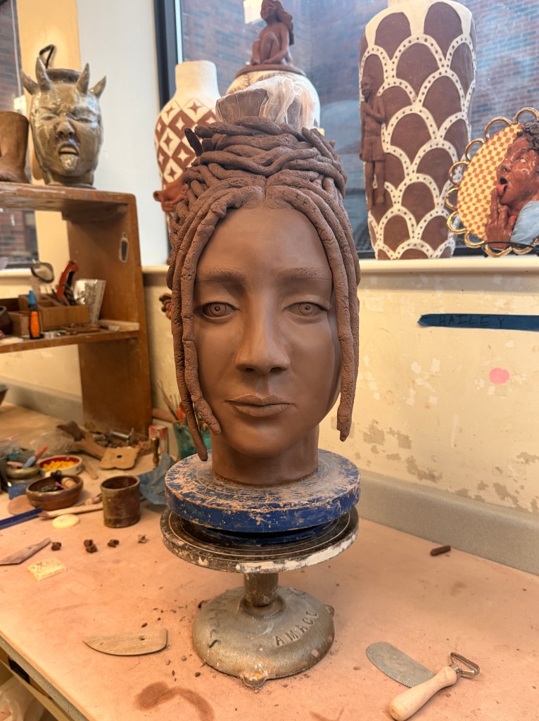 On the top of the head you can see that I’ve started building the base for the vessel that will sit above it. I’m still thinking about the exact shape I want for the vase. I considered referencing historical vessels from my ancestry, but I’m not sure if those forms would aesthetically fit the piece.