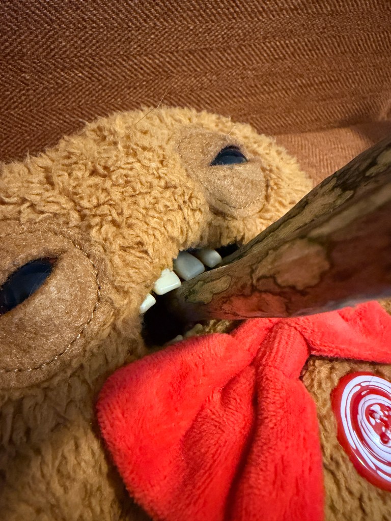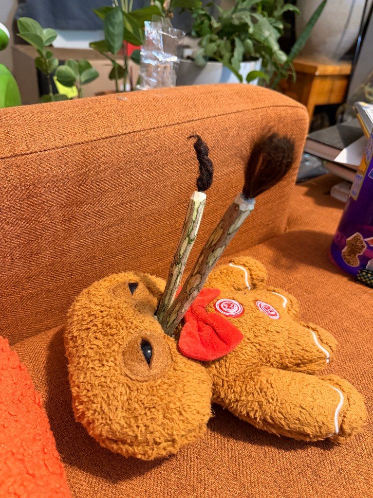 For my brushes, I cut off a little branch from my neighbor’s tree (shh, don’t tell her), and I used strands of human hair that I had saved for about 3 years from mine and my partner’s hair. I thought it would be hilarious to make a curly hair brush lol, she is very useless but cute nonetheless! I think the non-curly brush could be more functional; I just have to give it a little trimming.
